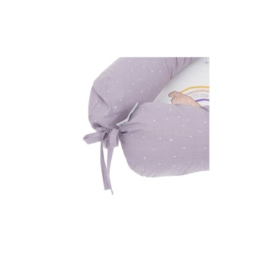 - Confeccionado em tecido macio 100% algodão com um unicórnio mágico acompanhado do seu ursinho de peluche no arco-íris multicolorido e do rolo com um alegre estampado de pontos brancos sobre fundo lilás.