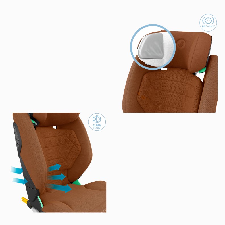 A RodiFix Pro² i-Size tem 3 posições de reclinação, o que permite que as crianças possam sentar-se ou dormir na posição reclinada. As almofadas de segurança AirProtect® não são apenas protetoras, também são extremamente macias e fornecem ainda mais amortecimento. A RodiFix Pro² i-Size possui acolchoamento extra no assento garantindo maior conforto e um encosto amplo, para aumentar ainda mais o conforto do seu filho à medida que ele cresce. Produzida com tecidos Eco Care premium 100% reciclados, a RodiFix Pro² i-Size distingue-se pelos detalhes da marca em relevo e linhas de costura premium. O assento também possui painéis de ventilação ClimaFlow melhorados, espuma respirável e tecidos que melhoram a circulação de ar e mantêm sempre o seu filho a uma temperatura confortável.